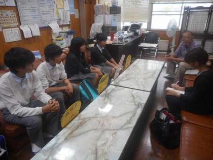 文化祭に向けて,1・2年生と8組で製作した飛び出し防止のウサギとカメの看板を,京都新聞社が取材に来られました。
