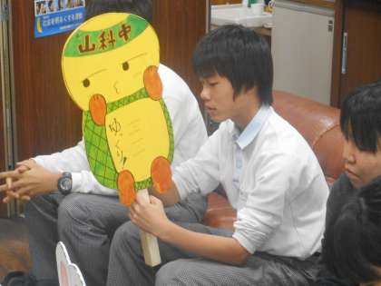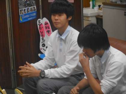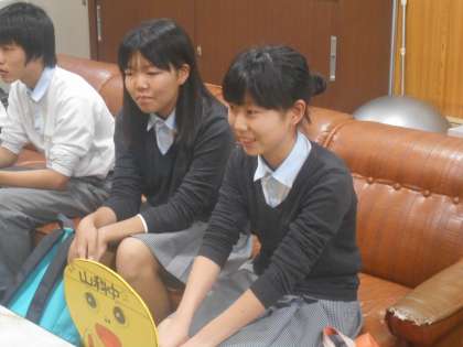 インタビューに答えてくれたのは,まずデザインを考えてくれた美術部の2年生須山さんと倉さん,製作委員を代表して2年生の伴君と1年生の那須君の4名です。