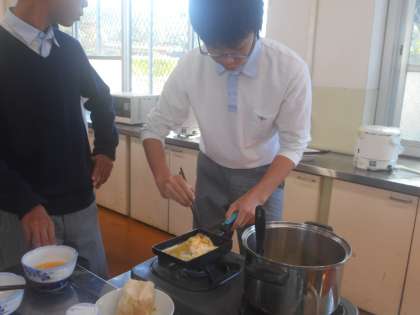 それぞれ「だし巻き」に挑戦しています。料理が好きで手つきがなかなか堂に入っている男子生徒や,毎日家で料理を手伝っている女子生徒は段取りや要領がよいですね。だし巻きも上手に巻けました。