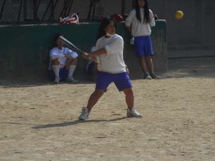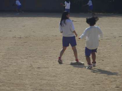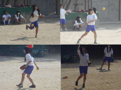 3年生の女子はソフトボールの授業です。女子の人数はクラスで12〜13人なので,守備についたら,外野が誰もいない布陣になり,内野の頭を越えると「長打!」になります。