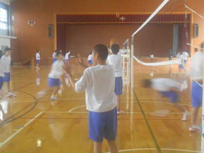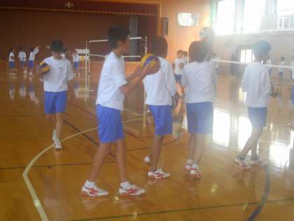 1・2組の体育。男子はバレーボールです。声を掛け合って元気にプレーしています。