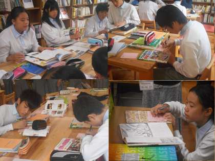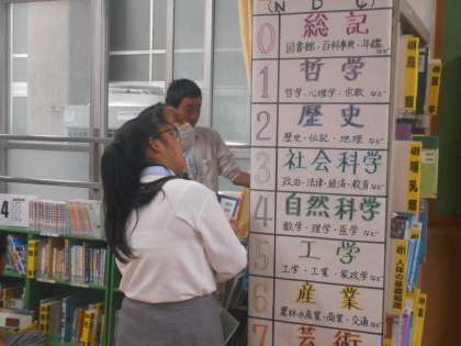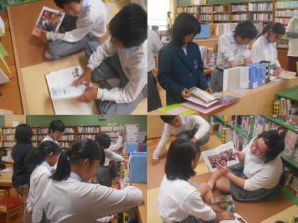説明を聞いた後、決められたグループで本を探して,記事を抜き取ります。タイトルだけでは探せないので,そこが難しいところです。