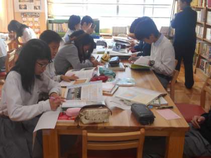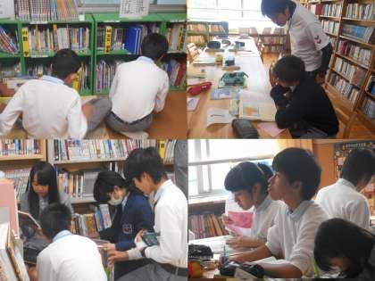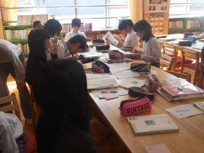 本が見つかったら席に戻って、内容を読みカードに記入します。本に没頭して時間の終わりまで読んでいる人もいます。こういう授業が図書館に親しむきっかけにもなってくれればよいと思います。