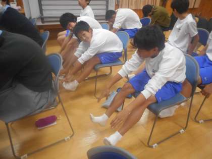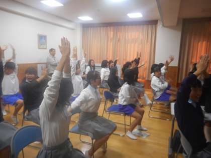 画面を見ながら係の生徒のかけ声に合わせて,椅子に座った状態でストレッチを行っていきます。