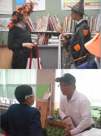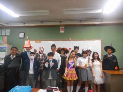 生徒たちが「trick or treat」と言った後、先生からの質問に答えます。