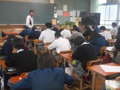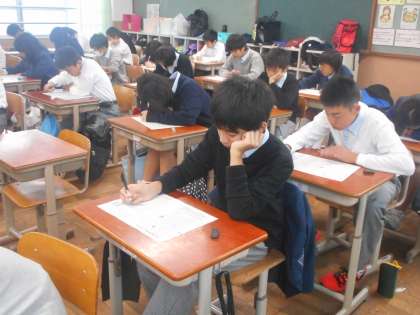 今朝は朝読書に代わって,宿題のまとめテストです。理科の問題に取り組んでいる1年1組のようすです。