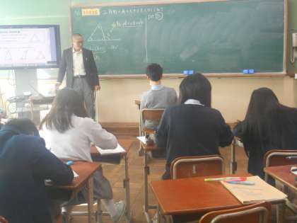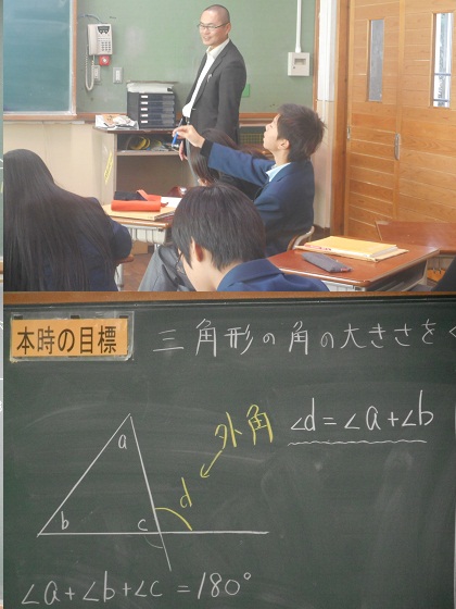 2年3組の数学です。分割の教室では三角形の外角を導き出す考え方を学習しています。
