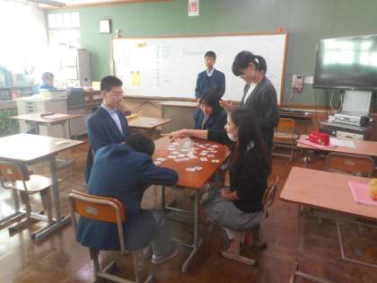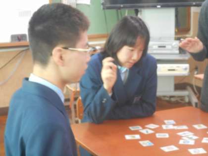 英語のカードを使っての単語の練習です。カルタ形式で今日は高橋君が読み上げてくれています。