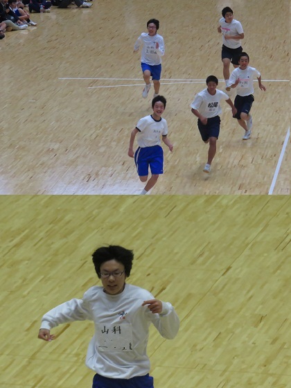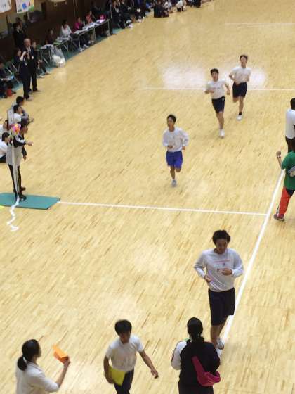 午後の最初の種目は,男女の200m走です。広い体育館を2周します。