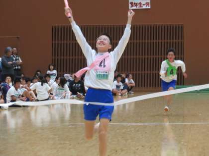 アンカーの石橋君も余裕の走りで,両手を突き上げてゴール!独走の1位でした。
