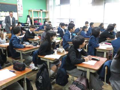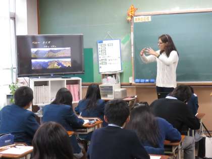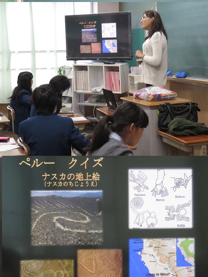 ペルーの名所などを写真にした者を使って,ペルークイズもありました。生徒たちも興味深く聞いています。