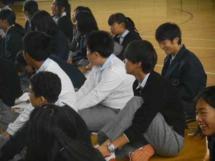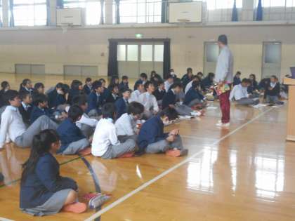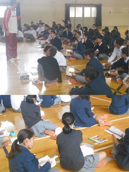 1年生の保健の授業で,今は合同で体育館で行っています。教室なら大型テレビですが,ここではプロジェクターでスクリーンに資料や写真が写し出されます。
