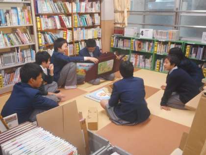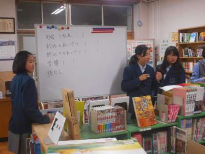 放課後の図書室で,2年生の図書委員が小学生への読み聞かせの練習をしています。当日の役割分担も決めていきます。