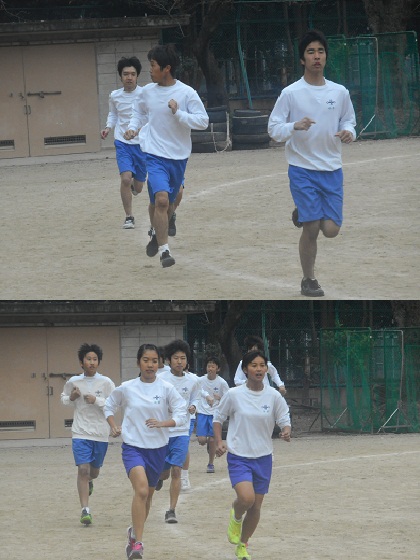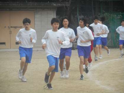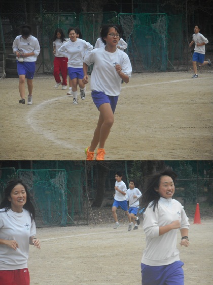 体育は持久走です。陸上やサッカーなど運動部はさすがに先頭で頑張ってます