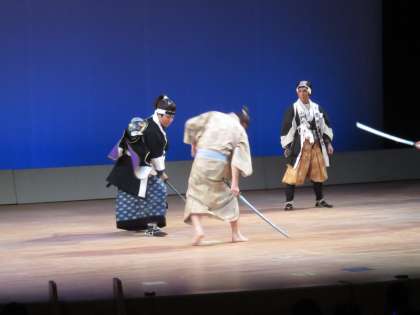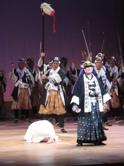 芝居のクライマックス、吉良邸討ち入り、勝ち鬨の場面です。応援の役者の方もおられますが,四十七士はすべて地元山科の自治連合会の方々です。