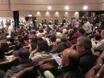 ホールは地元の方や観光客の方で満席です。ここから更に大石神社を目指して出発です。PTA本部の中川さんの息子さん(本校卒業生)や元PTA会長の方など,学校ゆかりの方も多数参加されています。