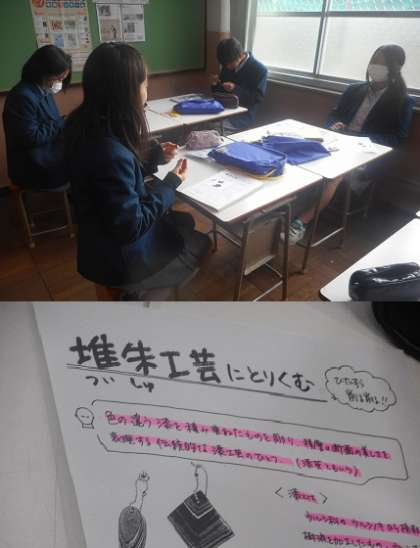 5組の美術のようすです。堆朱工芸というものにチャレンジしています。削っていくと次々に綺麗な色が出てきます。どんな色が出てくるかも楽しみのようです。