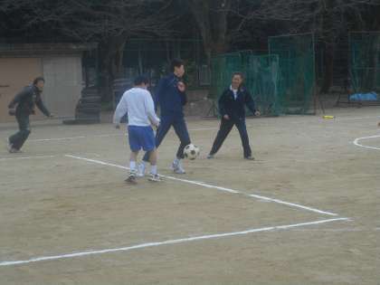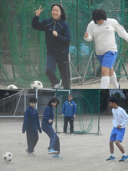 今日はグラウンドでサッカーに取り組んでいます。準備運動のランニングやドリブルの後,小さなコートで練習してからゲームを行います。