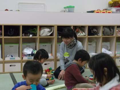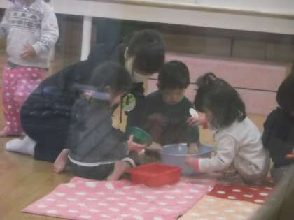 暖冬と言われていたのに、今朝は吹雪いてました。外遊びができないので、安朱保育園ではバケツに入った雪の感触を楽しむ活動や、お部屋の中でのお遊びでした。体験の二人は、園児さんに寄り添って優しく語りかけていました。