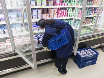 今日は1階食品売り場の乳製品などの冷蔵庫で作業をしています。