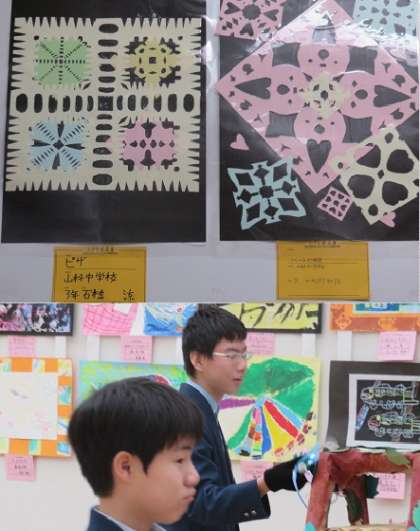 共同制作の貼り絵と美術の時間の作品が,まず目に入りました。清水の舞台は色合いも鮮やかでひときわ目立っていました。