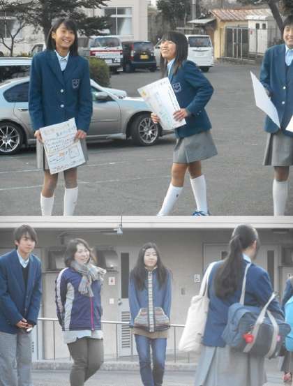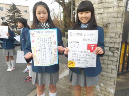 今日から生徒会の「ダルニー奨学金の取り組み」が始まりました。校門で写真にあるような書き損じハガキの呼びかけを行っています。