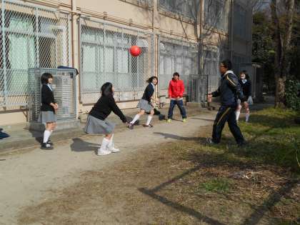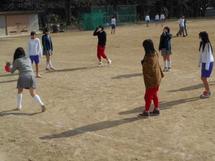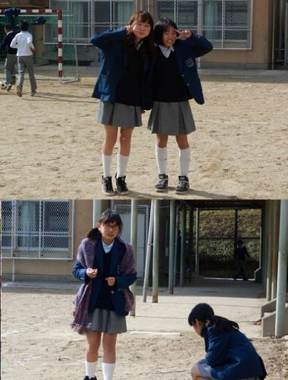 1年生の女子は,グラウンドに何やら描いて「写してください!」と言うことでしたが,地面は上手く写りません。3年生の女子は,先生と一緒にバレーボールです。