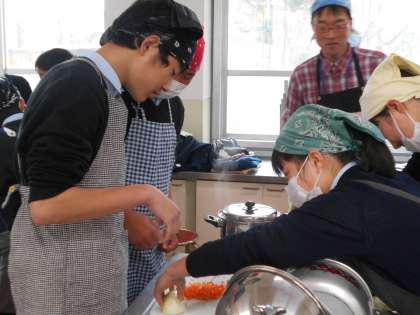 調理の段取りが頭に入っているか,ファイルに書いてあることを頼るかで,作業のスピードが違います。担任の福嶋先生も思わず手伝っています。