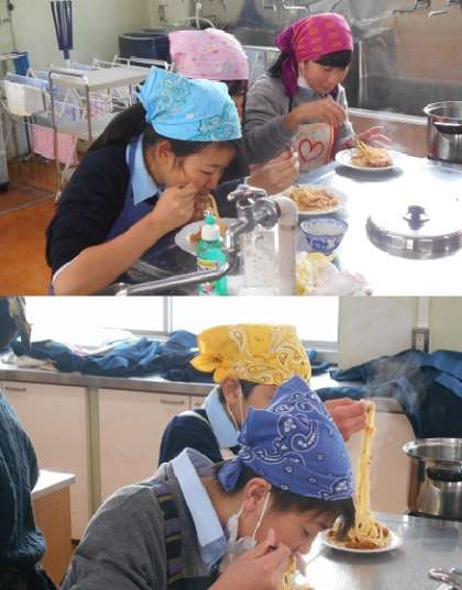 茹で上がったら素早くお皿に盛りつけて、「いただきます!」この時点で終わりのチャイムまで,あと3分で,みんな焦ってます。