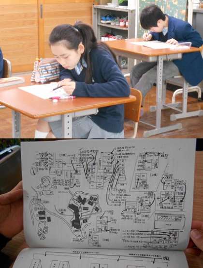 8組では,2月15日から行われる,花背山の家での宿泊体験合宿についての説明です。館内地図で泊まる部屋やミーティングルームを確認し,食堂へのルートも見ています。