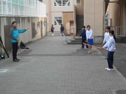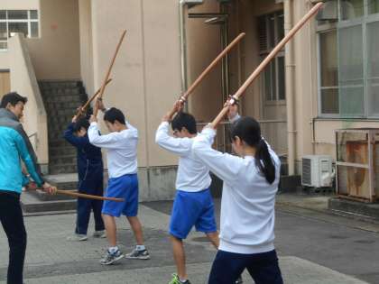今日は体育館が使えないので,中庭で木刀を使っての練習です。