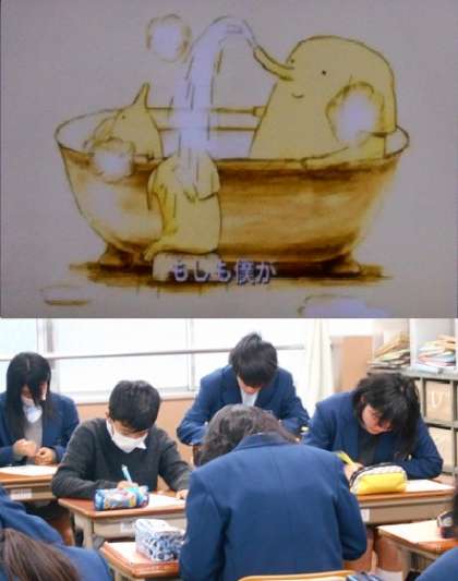 最後に「象の背中」という,死期を悟った主人公の家族への思いを描いた短いアニメを視聴し,それぞれが感想を書いて終わりました。