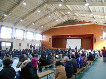 学校運営協議会の深川会長と学校長のあいさつの後,グループごとに生徒と地域の方が一緒に各教室に移動してトークを始めます。