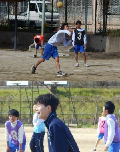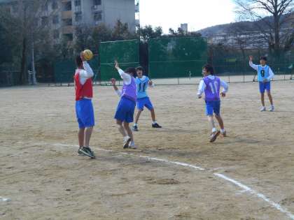 1年1・2組の体育です。今回は男子がグラウンドでハンドボールです。
