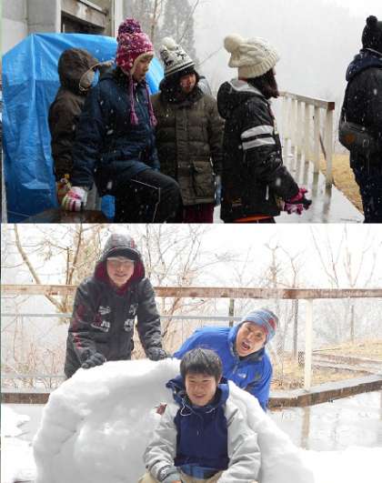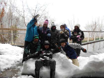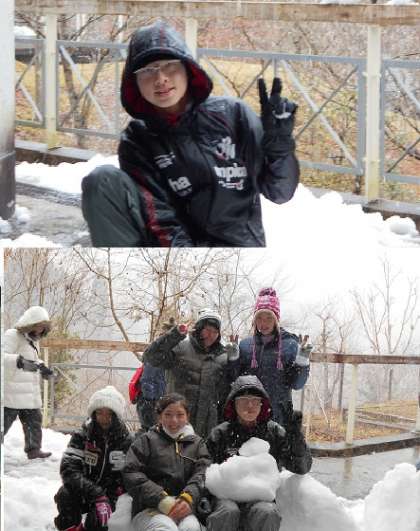 道路には雪はなかったようですが,山の家は雪の中でした。宿舎のベランダで雪遊びです。