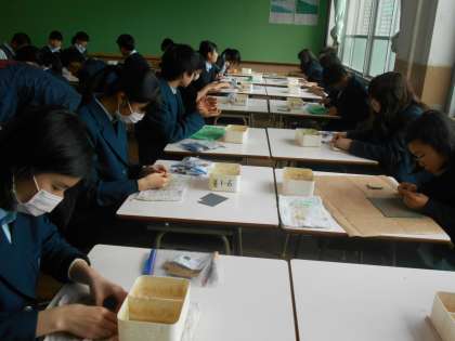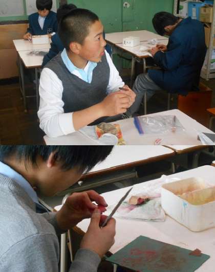 堆朱という堆積物を磨いて綺麗な色を出しています。完成品はキーホルダーになるのでしょうか。そろそろ完成に近づいているようです。