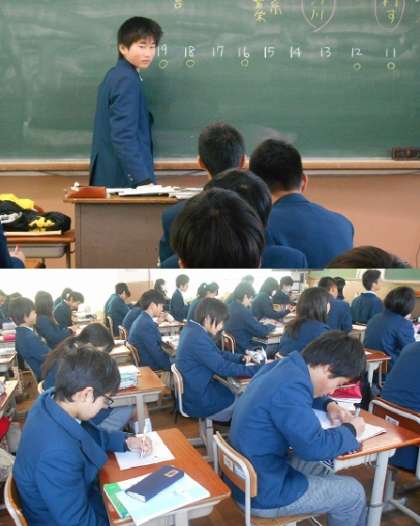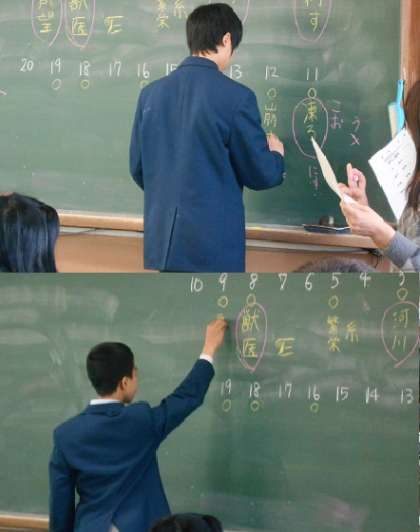 読みの問題はその場で答え,書きの問題は前に出て黒板に答えを書いています。