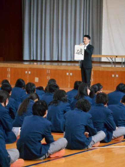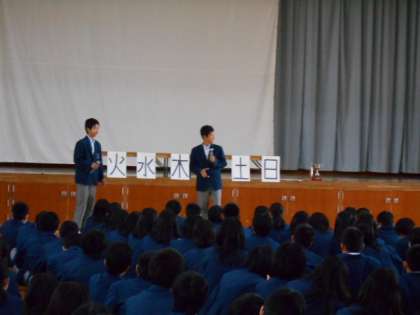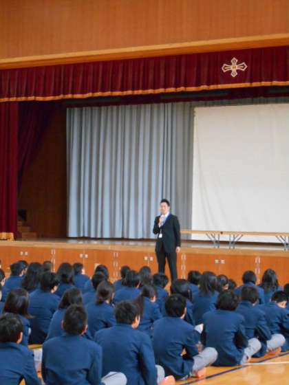 表彰の後は学年主任の宇津木先生,生活指導の岩田先生のお話です。最後は生徒の発表もありました。
