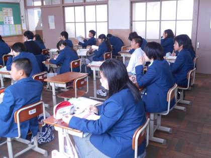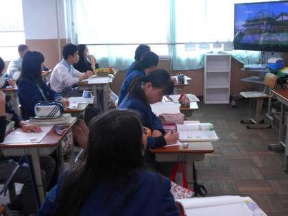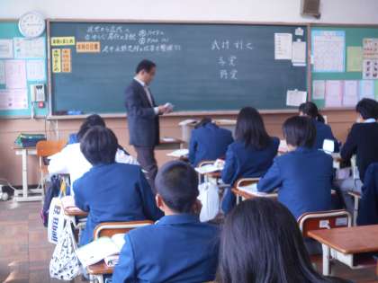 こちらは3年6組のようすです。社会科は2人の先生で担当し,6組は武村先生です。