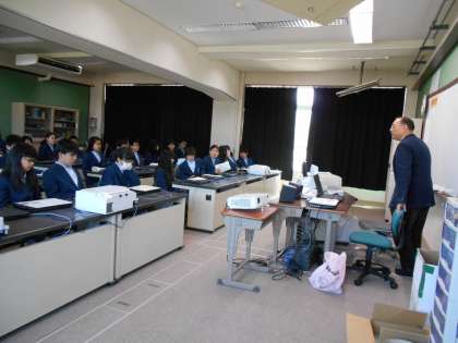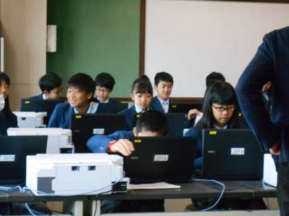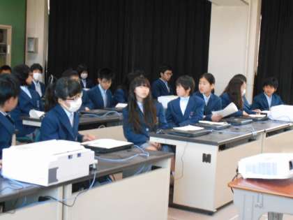 1年生は初めてのコンピューター室です。今年からパソコンなどの機器や生徒椅子も新しくなりました。