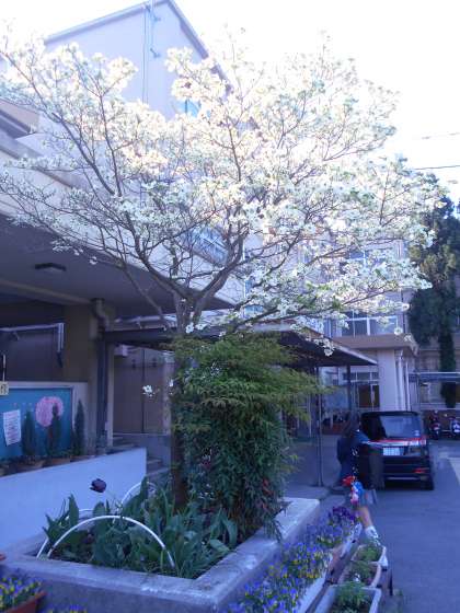 校門前を陸上部が掃除してくれています。体育館前の「花水木」が綺麗に咲いて,生徒たちを迎えてくれています。