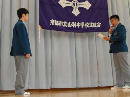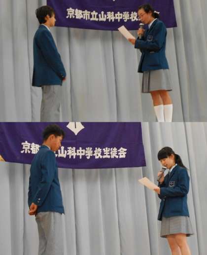 認証式では,各委員長から学級の代表に認証状が渡されます。