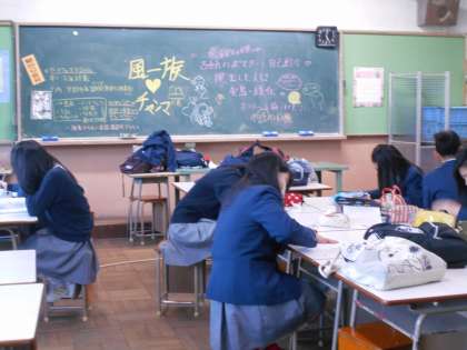 今日は1年生の体験もなく,すこしほっこりした活動日です。黒板に銅駝美術高校の1・2年生向けのオープンスクールの案内が書いてありました。さっそく何人か申し込んでいるようです。