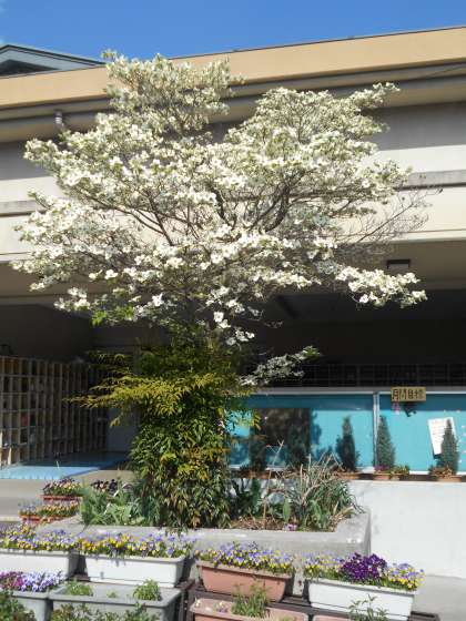 桜が散って,今度は体育館前のハナミズキ(花水木)が,きれいに咲いています。ハナミズキは,別名「アメリカヤマボウシ」とも呼ばれ,日本では1912年に,当時の東京市長の尾崎行雄が,アメリカのワシントンD.C.へ桜(ソメイヨシノ)の苗木を贈ったことで,そのお返しとして1915年に贈られたのが最初とされています。このハナミズキは日米友好の架け橋ともいえる花です。