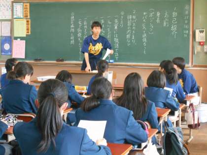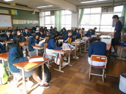 女子バスケット部も新入部員多く,1年生の教室も満杯でした。キャプテンを中心に,しっかりミーティングをしています。