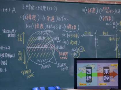 高緯度,中緯度や低緯度。東経・西経の語句など,難しい地理用語がたくさん出てきます。