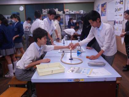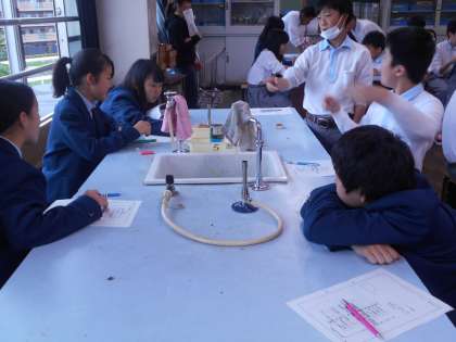 2年4組の今日の理科は,理科室で燃焼実験です。