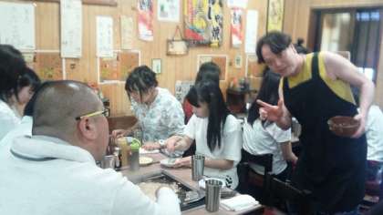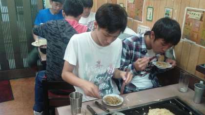 月島でクラスごとに分かれて、もんじゃ焼きを楽しみました。