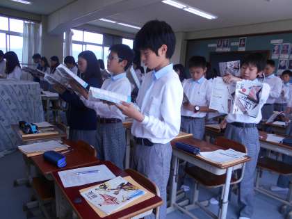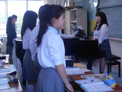 1年2組の音楽です。発声練習の後、「はるかな道へ」を練習しています。