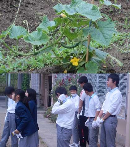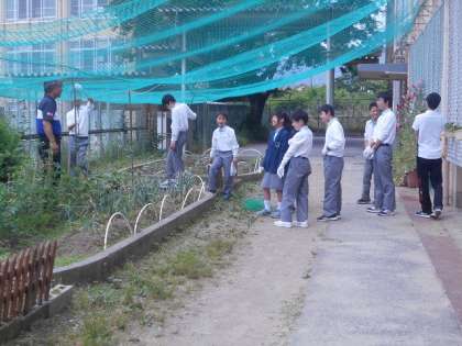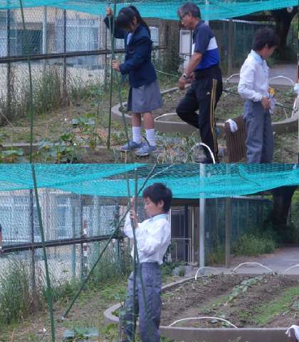 キュウリやミニトマトなどを育てていますが,キュウリは植えに高く伸びるので,支柱を立てなくてはなりません。今日は支柱の立て方をみんなで工夫して立てています。